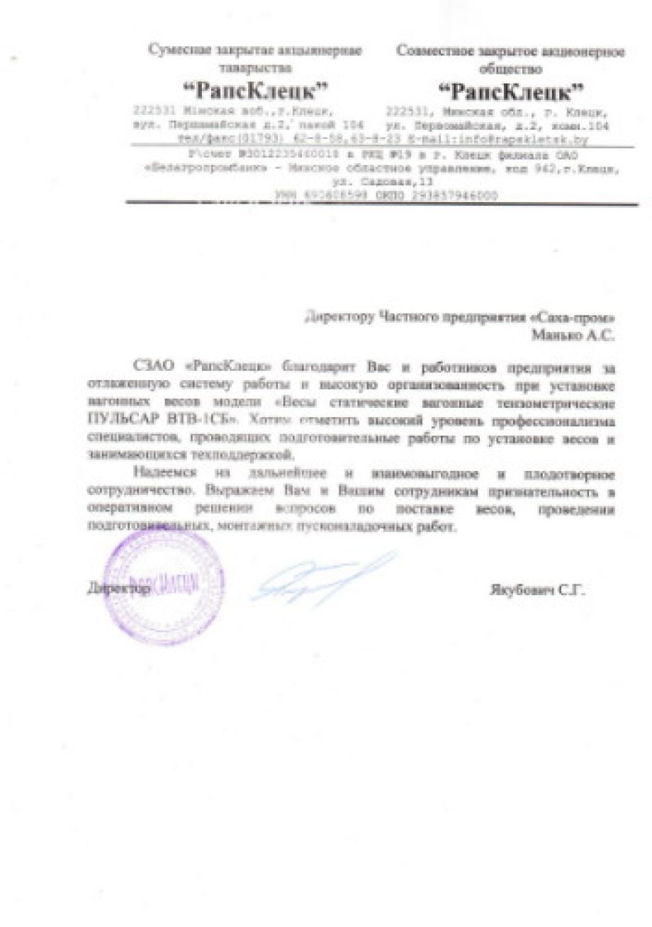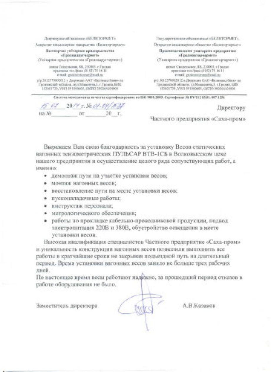 Выражаем Вам свою благодарность за установку Весов статических вагонных тензометрических ПУЛЬСАР ВТВ-1СБ в Волковыском цехе нашего предприятия и осуществление целого ряда сопутствующих работ, а именно: