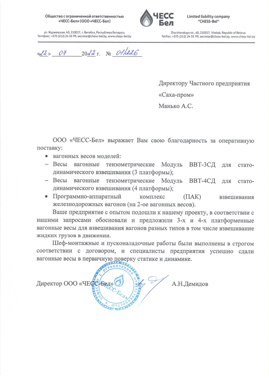 ООО Чесс Бел» выражает Вам свою благодарность за оперативную поставку: